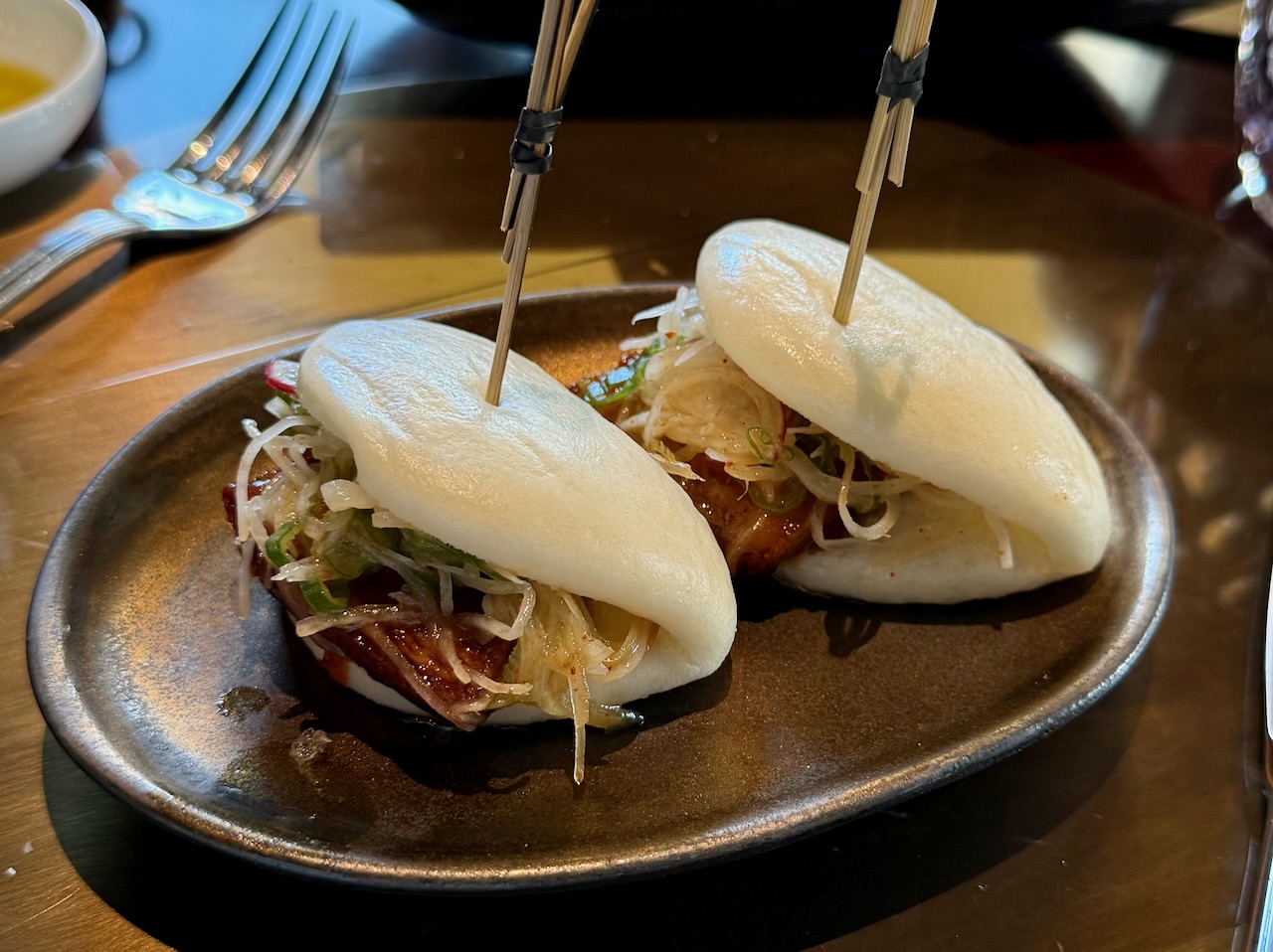 Steamed bao, sweet chilli pork belly, daikon and lemongrass.