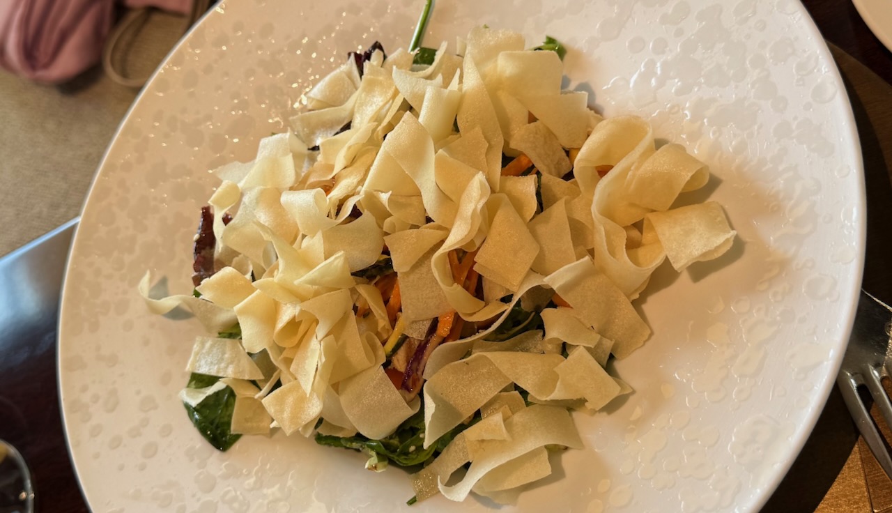 Asian chicken salad with quinoa, seasonal vegetables, Wonton and sesame dressing