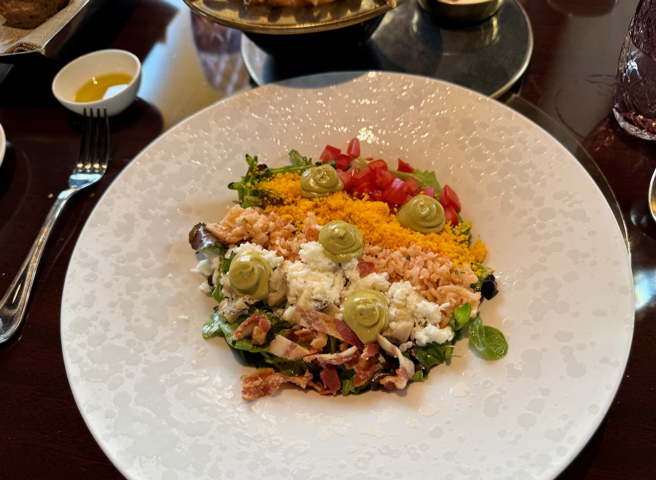 California cobb salad with lobster, blue cheese, bacon, avocado, tomato and french dressing.