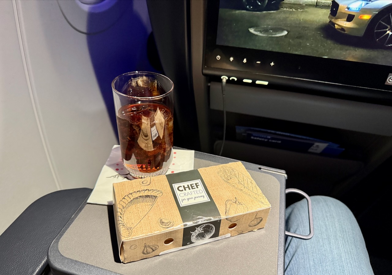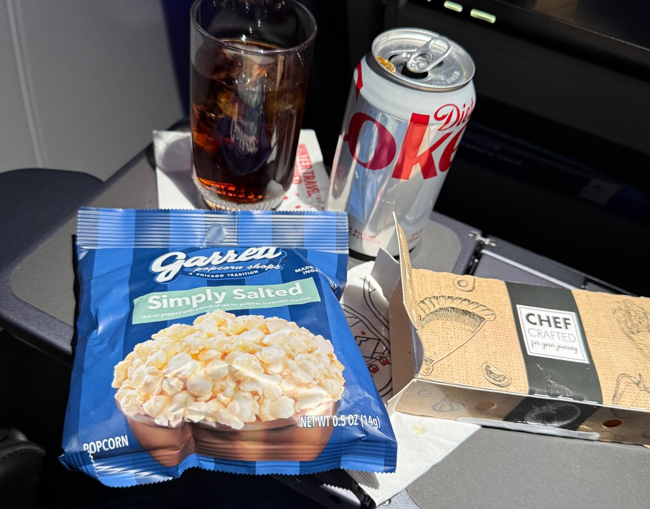 No meal service (just under 900 miles) although United has started serving warm snacks in addition to the snack basket.